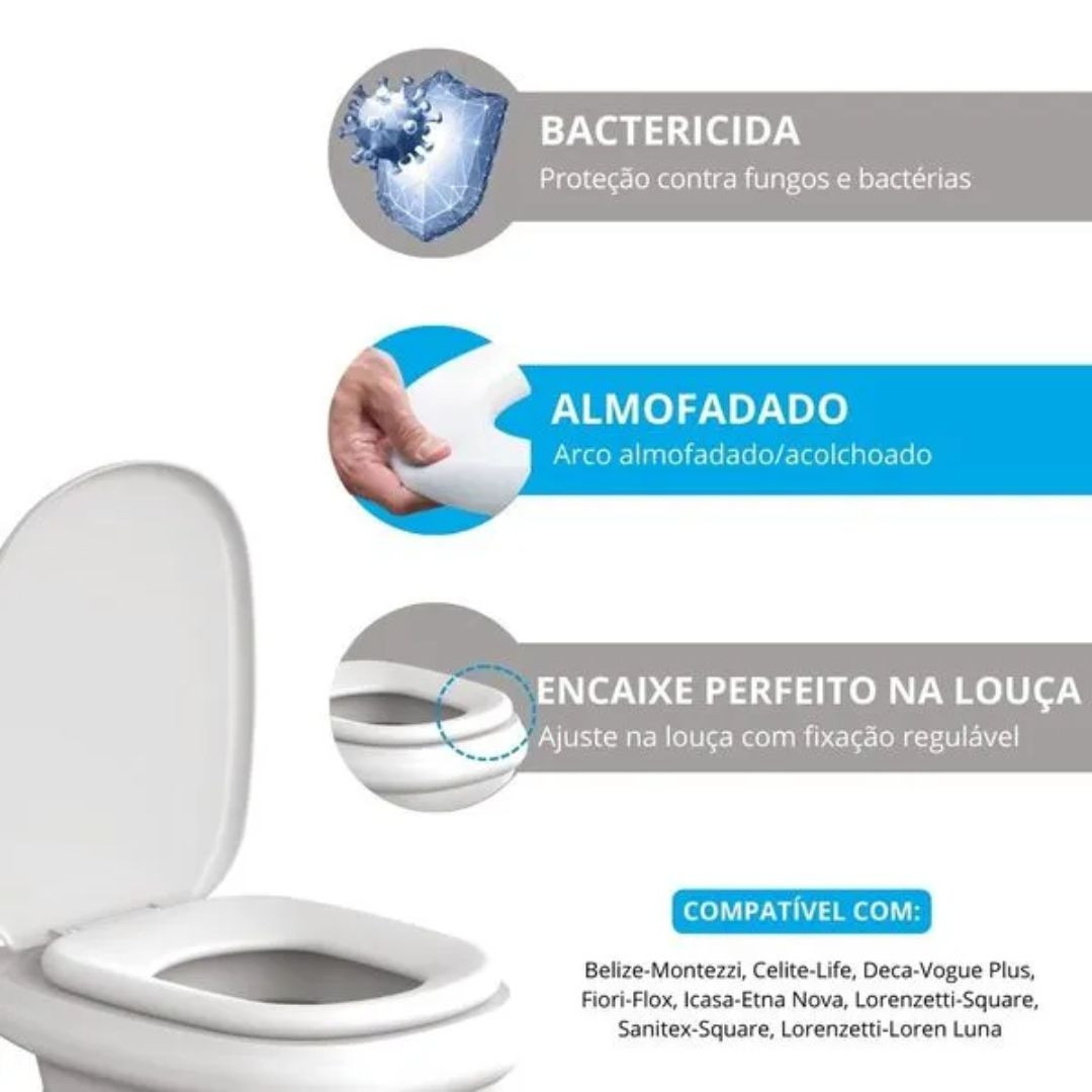 Fixação regulável, garantindo encaixe perfeito no vaso sanitário.