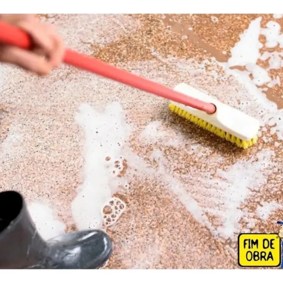 - Aplique a solução com uma vassoura e esfregue com rodo de espuma ou brocha.