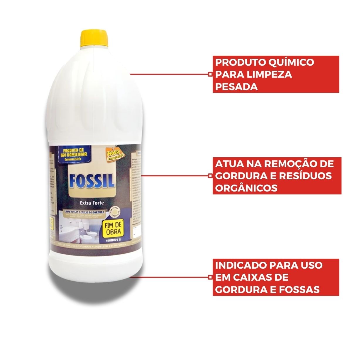 Experimente o poder da limpeza com Fossil Extra Forte, o seu aliado para manter suas fossas, caixas de gordura, pias, vasos sanitários, ralos e tubulações de esgoto impecavelmente limpos. Formulado com uma fórmula poderosa e eficaz, o Fossil Extra Forte é a solução domissanitária que você precisa para garantir um sistema de esgoto livre de obstruções e odores desagradáveis.