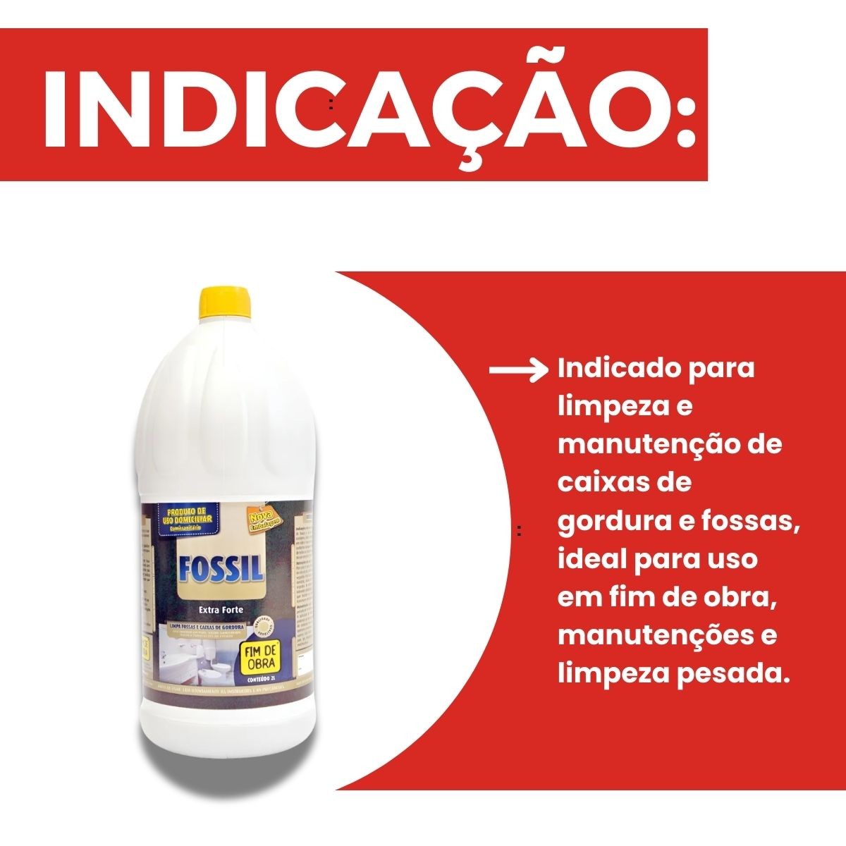 Formulado especialmente para a limpeza de fossas e caixas de gordura, assim como pias, vasos sanitários, ralos e tubulações de esgoto. Ao se aplicar Fossil em ralos e vasos sanitários, diretamente ou diluído em água conforme dosagem indicada na bula, promove-se a limpeza de todas as tubulações de esgoto da residência, sem interferir no uso normal de seu sistema sanitário.