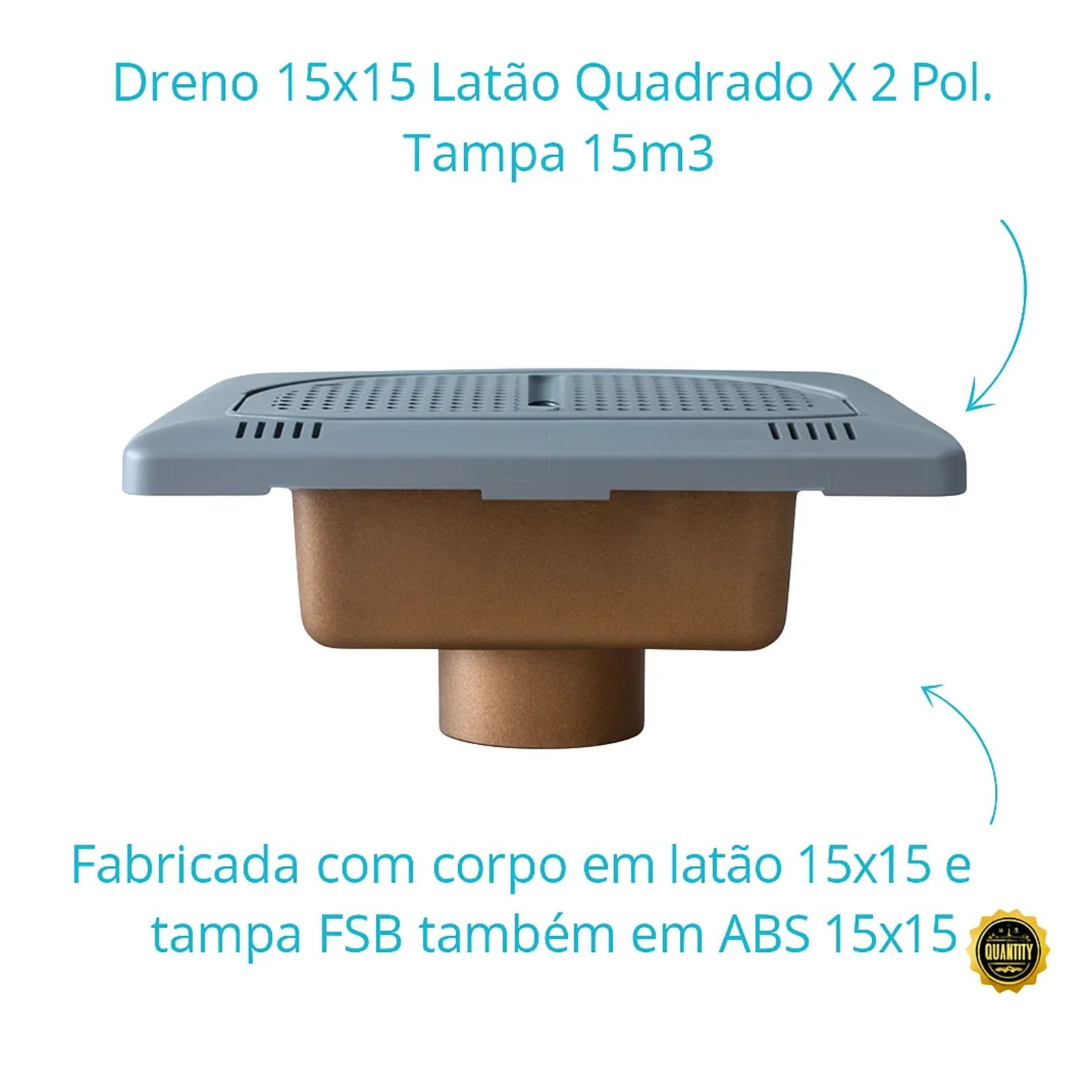 Produto: Dreno 15x15 Latão Quadrado x 2 Pol. com Tampa 15m³