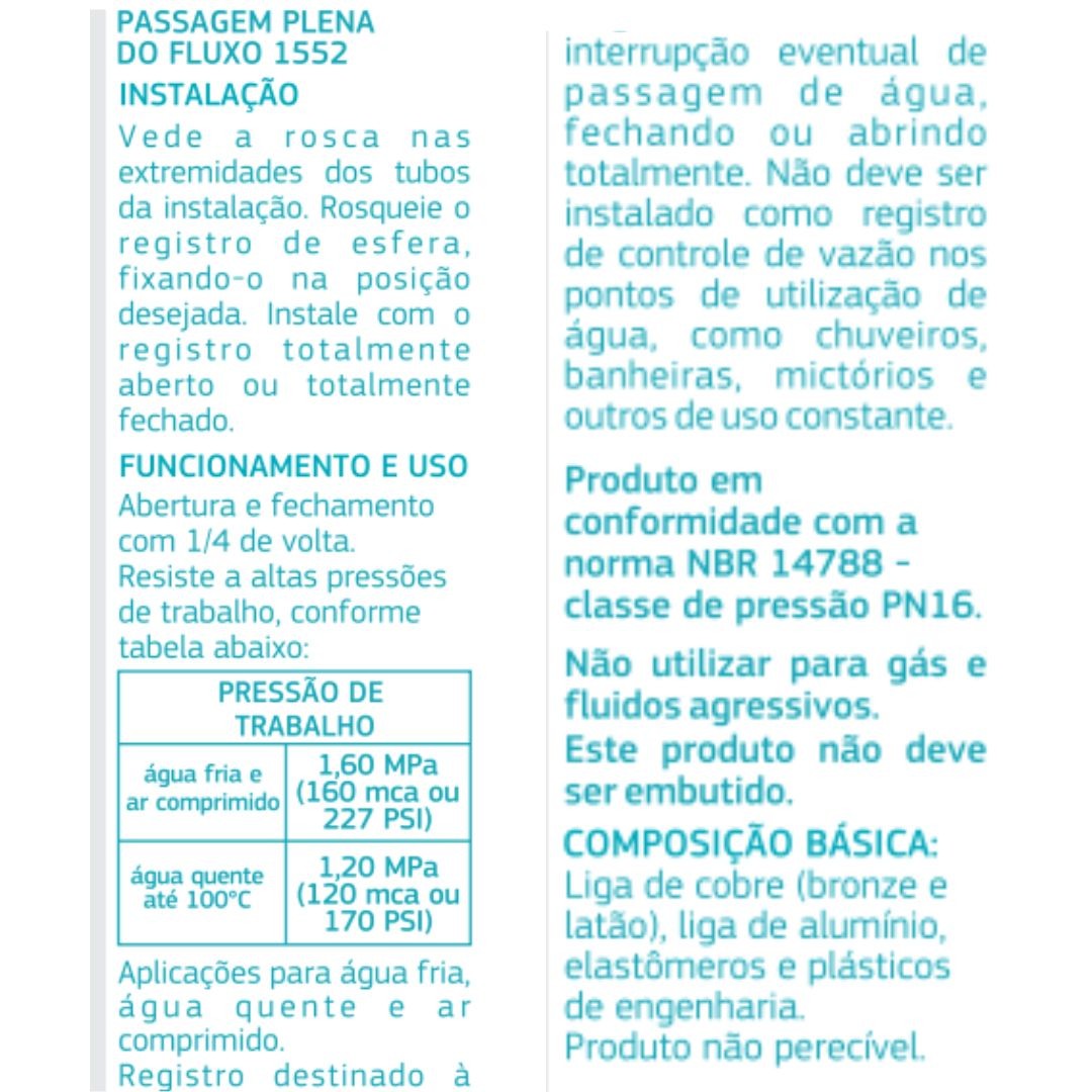O Registro de Esfera 1.1/4? 1552.B.114 Deca é a solução ideal para o controle eficiente do fluxo de água em sistemas hidráulicos que exigem robustez, segurança e alto desempenho. Desenvolvido com o padrão de qualidade da Deca, este registro oferece excelente vedação, longa vida útil e funcionamento confiável mesmo em condições severas de uso.