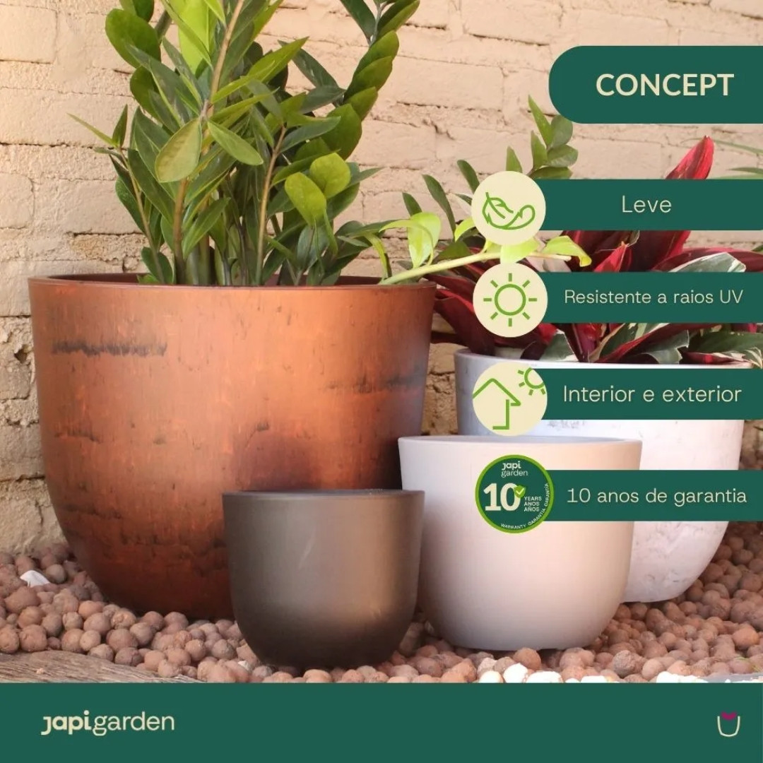Produzido com tecnologia de rotomoldagem e matéria-prima em polietileno, o Vaso CONCEPT é leve, resistente a impactos, não desbota e suporta variações climáticas, sendo ideal tanto para ambientes internos quanto externos. Por não possuir furo de drenagem, é perfeito para uso decorativo ou com cachepôs, oferecendo versatilidade na composição de plantas naturais ou artificiais.
